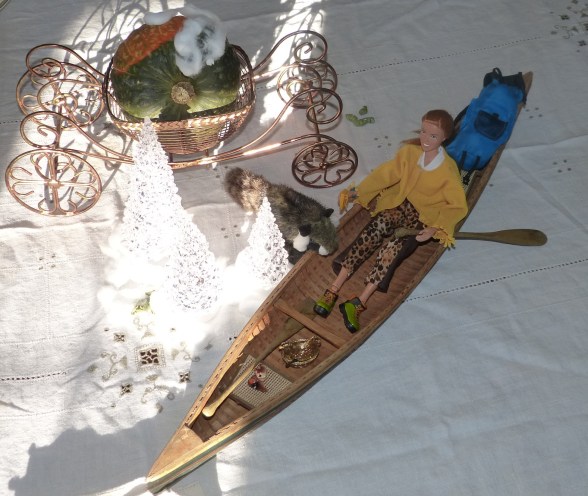 So my centerpiece was an acknowledgement of the changes: Cindy is not going to ride in the coach. She has a canoe and paddles and a backpack, sleeping bag, stove, water bottle and GPS. She is going to find her own way and paddle her own canoe.