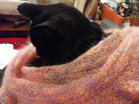 I took the photograph two days ago with my phone: Boa was on my lap and I wrapped her in the shawl I’d knit, and she was so relaxed…. that’s how we need to take care of everyone with influenza.