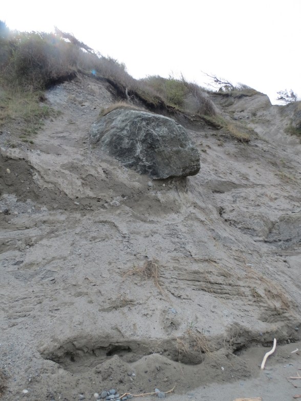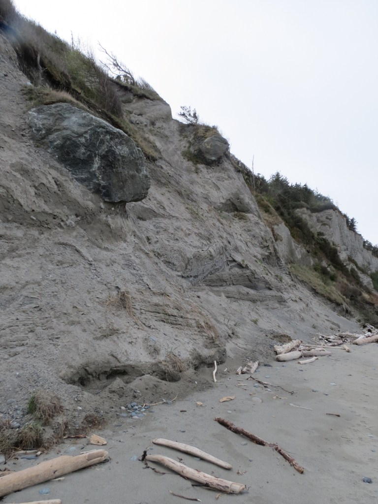 This is East Beach on Marrowstone Island. After the rains, sections of the sand cliff have come down, with trees in the process of dying and the grass still intact in some piles. There are some seriously large chunks of clay that you would not like to be under when it came down.