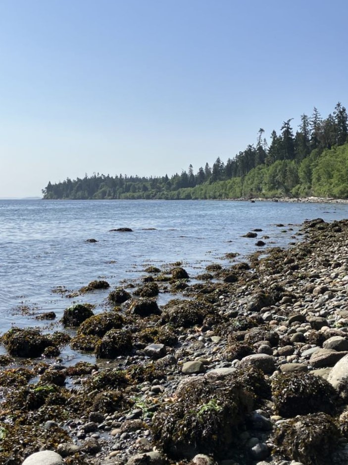 I walked North Beach twice this week and Marrowstone Island once so far this week. This is from North Beach yesterday. This rock makes me a little anxious because I think it will come down. It’s well above my head and is probably 5 feet by 5 feet. Bits of the cliffs fall and I do not want to be under them.