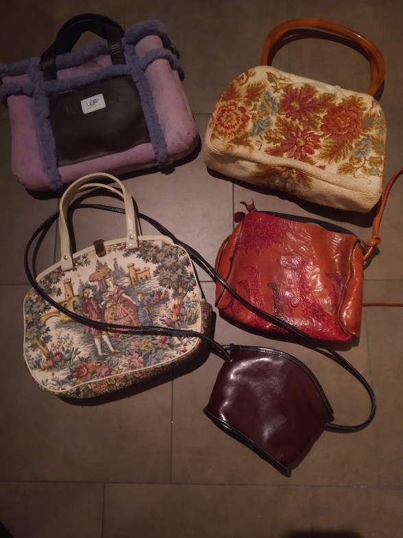 This summer she said that her purse is wearing out. As a minimalist she has one purse. I ask, “Would you like to see if I have one that you like?” It so happens that as I was trying to recover from pneumonia, a local garage sale had 20+ year old designer purses for $3 each, because the house was going on the market. Got to get rid of the stuff.