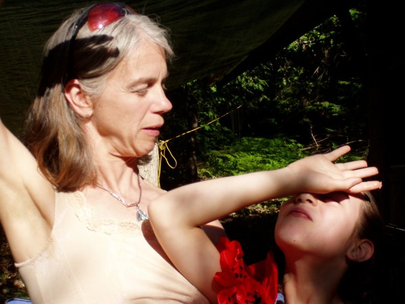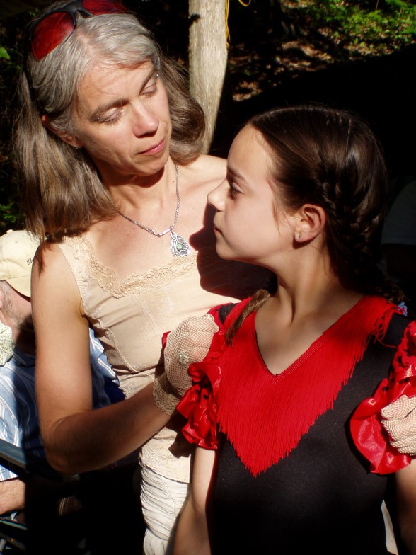 The photograph is me and her daughter, in costume, at Lake Matinenda in Ontario, Canada, in 2009. I brought a rather demented flower fairy costume. The gloves are my mother’s: crocheted, uncomfortable, romantic and impractical. The whole outfit was entirely silly and impractical for the woods. My sister would bring long ball gowns up to the woods. We played dress up at my grandmothers with our cousins, in my mother’s 1950s prom dresses, in the middle 1970s. We thought her dresses were ridiculous. So were ours, of course.