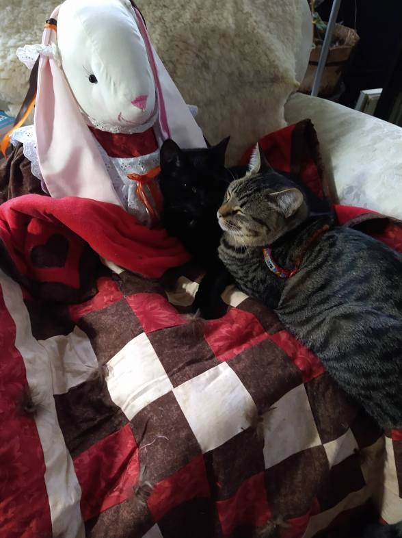 I went on a trip when the cats were still young. They sat on the bunny’s lap a lot when I was gone.