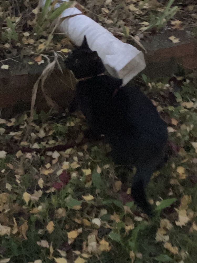 It is getting darker and the sun is rising later. Halloween is on a Tuesday, three weeks from now. I am walking the cats in the predawn time and sometimes in the dark. Sol Duc is black and her harness is dark red and I can’t see her at all if it’s good dark night. Our rules are that I let the leash go if they stay in my yard or the neighbor’s yard. We have a fast road for our town and I have had a cat get killed.