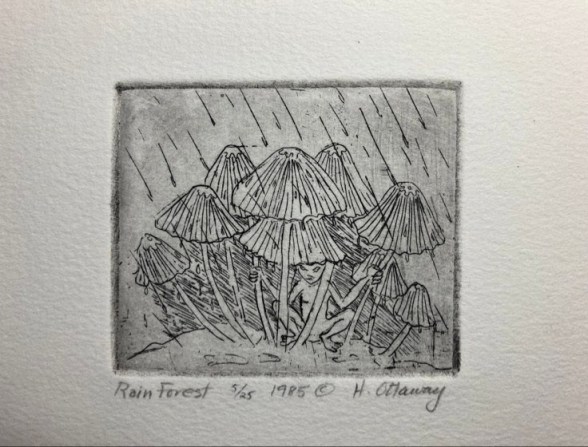 This etching is 2.5 by 3 inches, titled Rain Forest, number 5 out of 25, 1985.