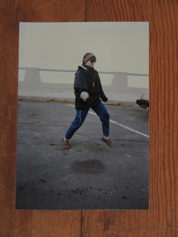 The photograph is my sister dancing with the invisible spirits… no, really we are on a road trip in the 1980s and stop for a hackysak break. She is gone from cancer.