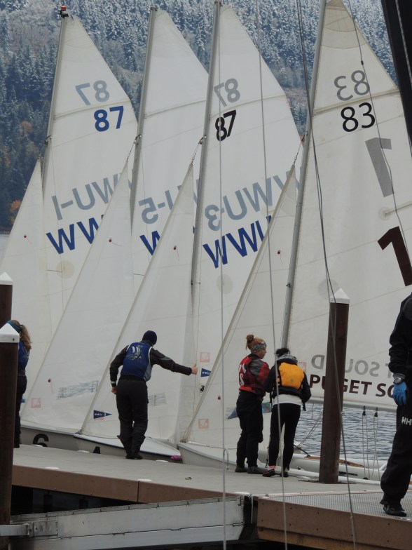 This is the hot swap at the regatta at Lake Whatcom last Sunday: where the boats come in, switch teams and all go out again. Fast and furious! I like the symmetry, all lined up.