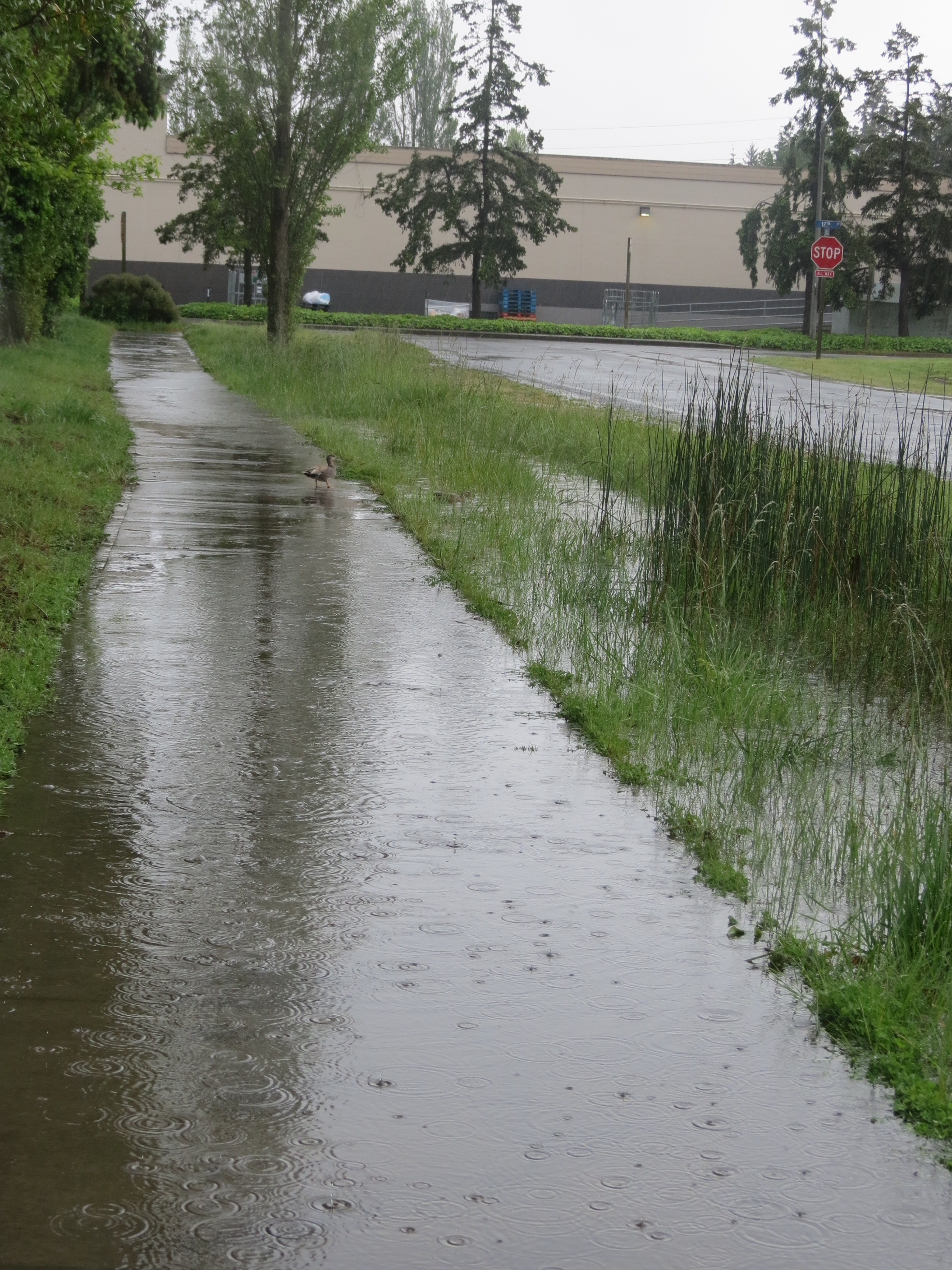 The parking lot had drained when I walked down 14th Street, but the ducks were investigating the ditches as very attractive small ponds.