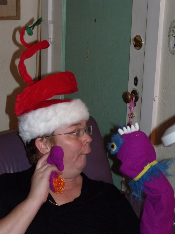 My sister and I could be so silly together. I bought the ridiculous Dr. Suess Christmas hat one year. On Christmas morning my sister wore it and then played with a Sesame Street style puppet. A monster puppet, where you could put different arms and eyebrows and eyes on for different moods. She and the puppet had a discussion about which arms the puppet would wear! And then she put all the velcro monster parts on her cashmere sweater! Ridiculous!