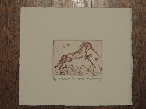 I have not done a full inventory of our art, so I don’t know how many I have of each of these etchings. These are 18 by 24, so technically difficult. I do not have the press, but I may have the plates, though they may have been damaged. And even though I know how to run etchings, I don’t have her skills in inking the plates and more importantly, wiping the right amount of ink off. I may have notes about the ink colors, but the trick would be finding them. And is the same paper still made?