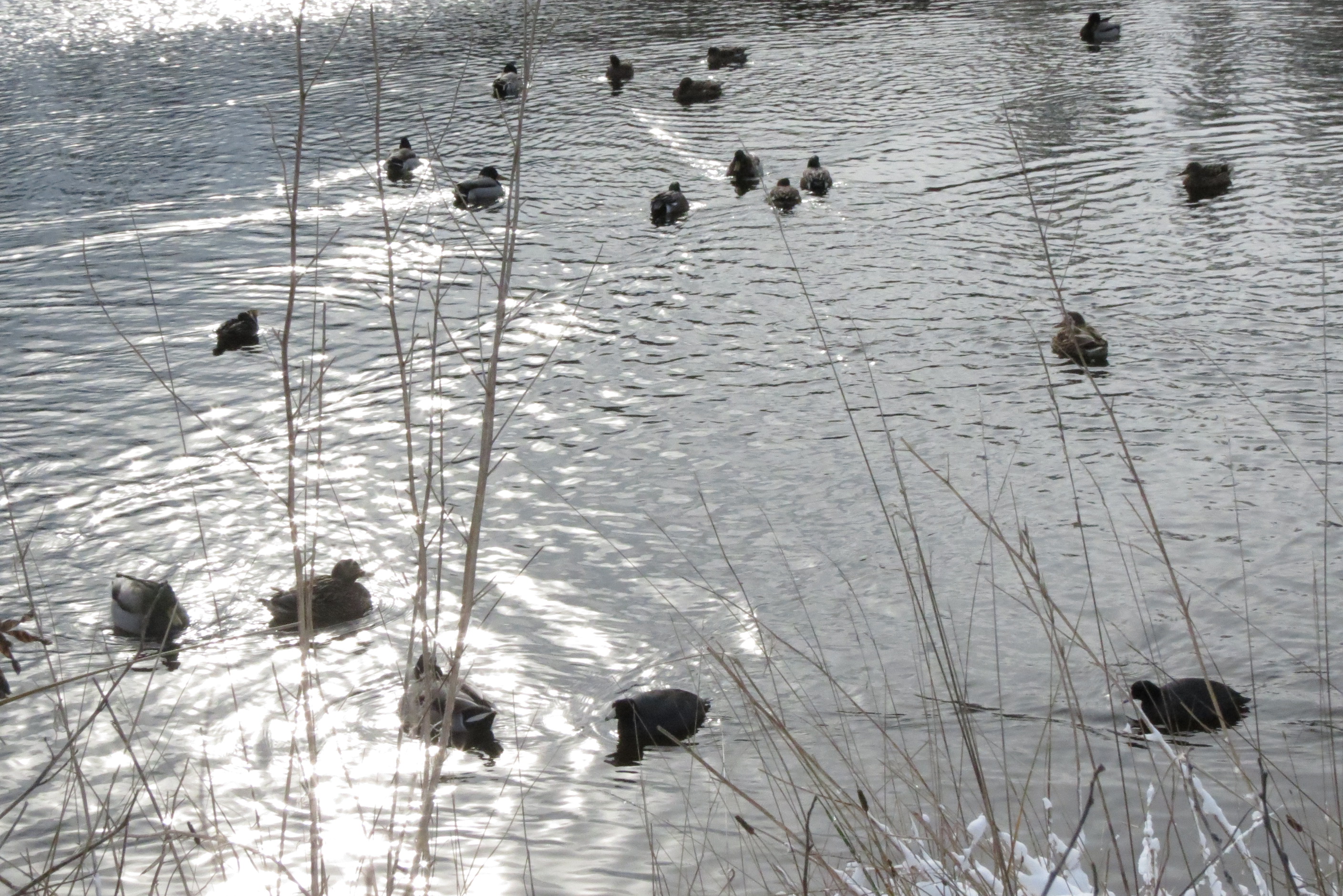 The first black crowned night heron that we spot is holding very still. Fishing? No, after a while we realize: napping. Napping with head tucked, on one foot and not caring when a coot swims by.
