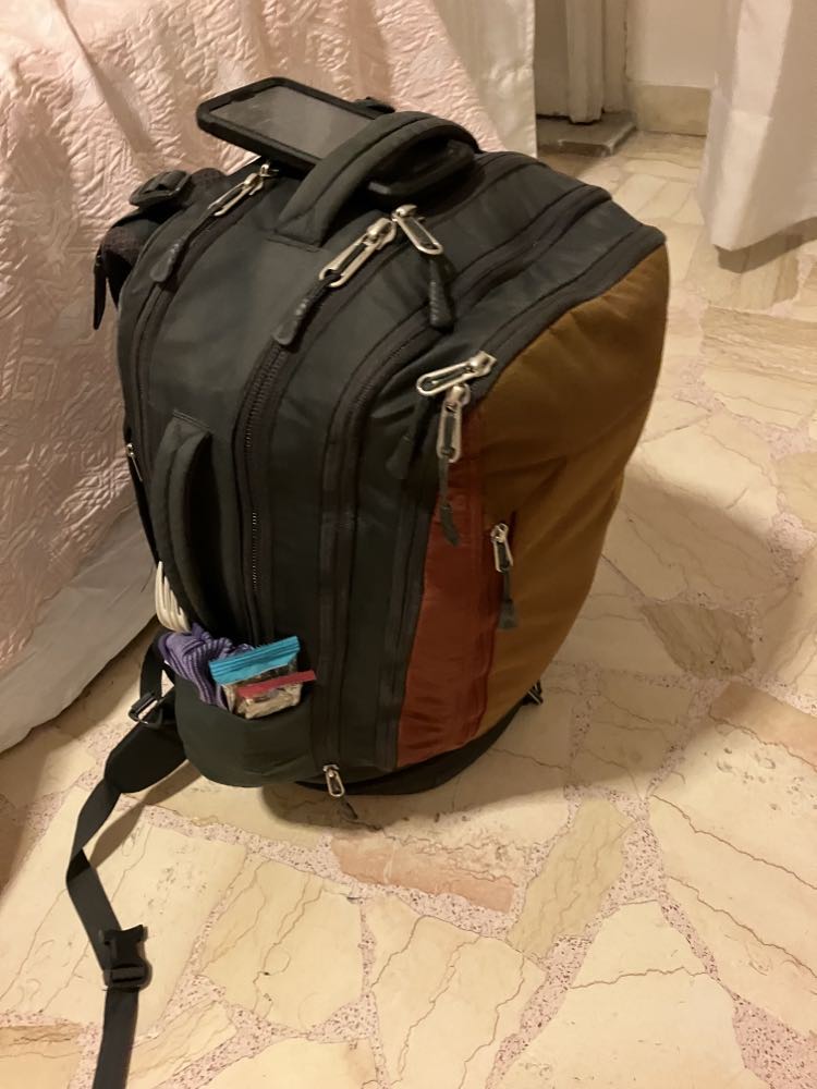 When I got off my last plane, I put the pack on and thought, either it is lighter or I am stronger. Both, I think, because I had eaten all the food while on the airplanes. Food is heavy!