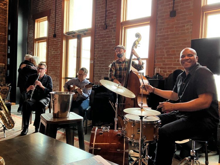Taken in June, at the Tuesday Johnathan Doyle and friends jazz at the Bishop Hotel. Johnathan was touring, so it is friends and more friends and more instruments! George Radabaugh, Jack Dwyer and the friend who plays trumpet.