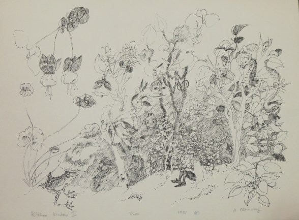 My mother Helen Burling Ottaway always had a wonderfully chaotic garden inside and outside. Kitchen Window is a pen and ink drawing that she then did a limited edition of copies, numbered and signed. She had many dual drawings and etchings. One would be realistic and the second…. maybe the second is what she saw.