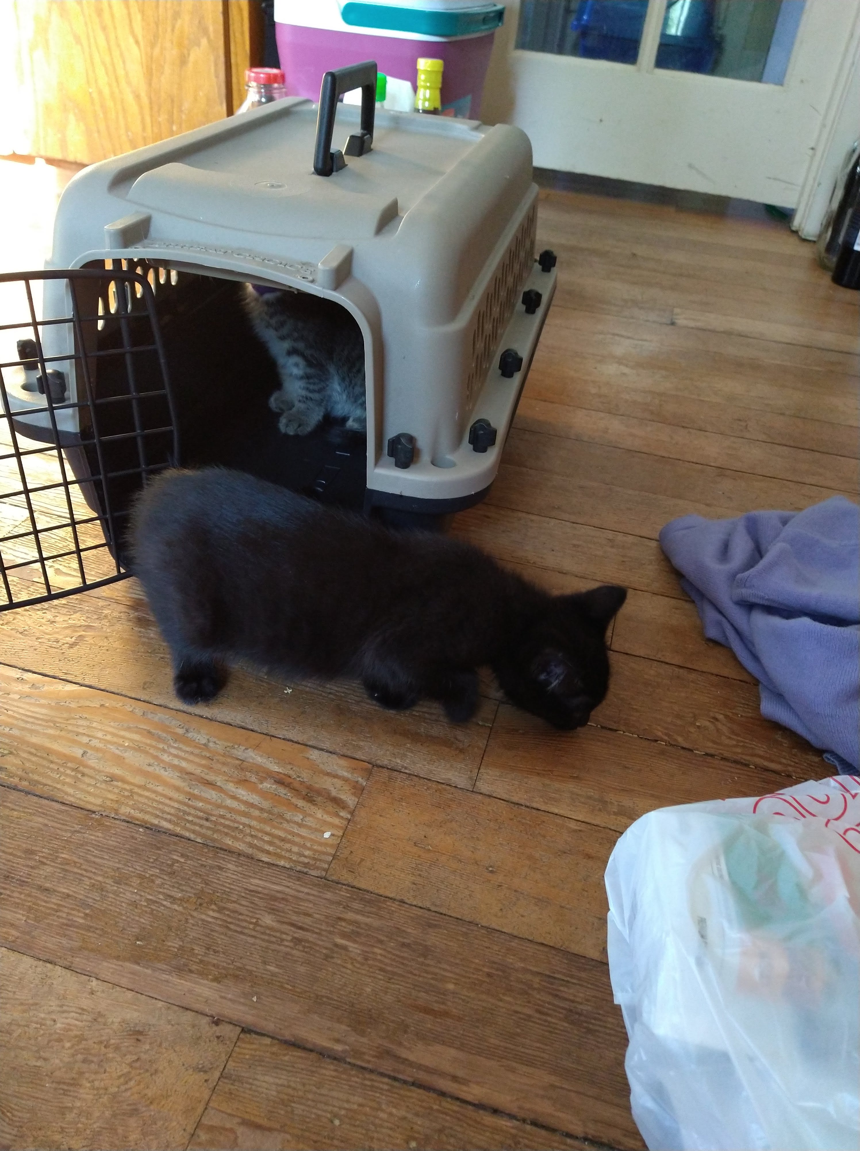 Two kittens arrived at my house on Monday. They were named Riffle (the black one) and Paddle (the tiger) so now are named Riffle Sol Duc and Paddle Elwa. They were a bit groggy from the hour drive and cautious at first. That lasted for no more than an hour.