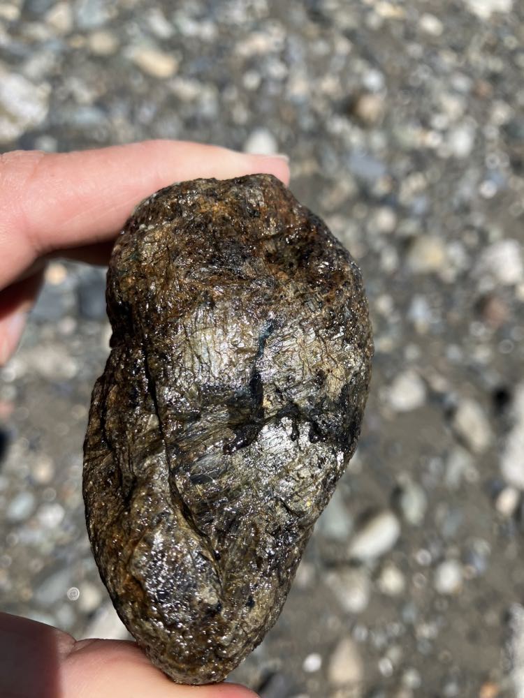 The surface has layers and layers of mica. Apparently there are 57 different mica minerals, here, so I am not enough of an expert to know which it is. I can see the layers of flakes of mica. This is a beautiful rock.