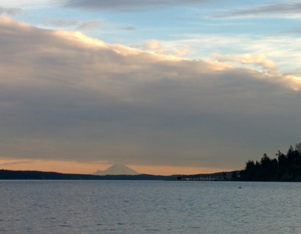 A distant Mount Tahoma taken from the beach with the evening sun lighting the edge of the front. Beautiful.