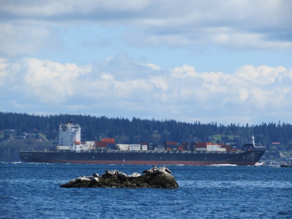 I took the photograph two days ago from East Beach on Marrowstone Island. The distance between the sea lions and the container ship is much further than it appears, and this is taken with a Canon PowerShot SX40HS zoomed most of the way out.