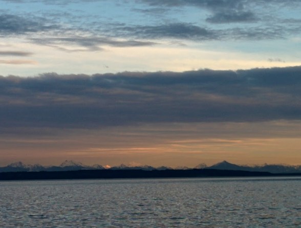 I took the photograph in the evening on the beach, with a gorgeous front and the mountains taking turns being lit by the evening. Is the rain nasty weather or is it the spring coming and bringing flowers? Do you celebrate “nasty” weather? Some days I do….