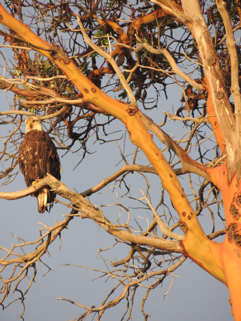 Let’s look closer at the eagle in the tree. Splotchy feathers, not quite fully mature.