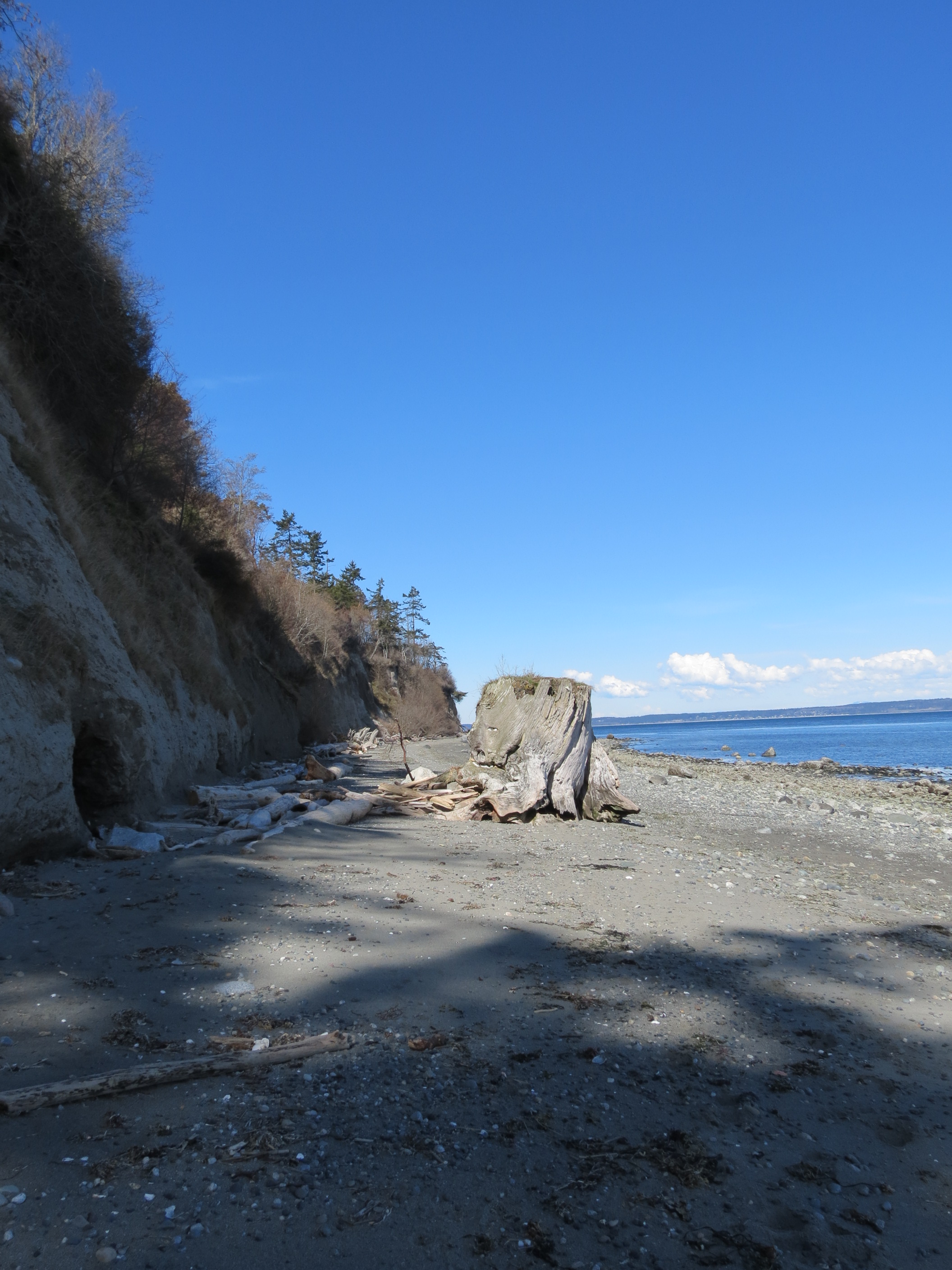 I start back a little and another section of cliff rains rock. The tide is fairly far out, so I walk near the water until I am back where there is no cliff. Scary. Sometimes large sections collapse all at once. Death occurs by blunt trauma rather than suffocation.