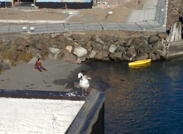 I like the elements in this photograph, the triangle of the adult, the kayak and the gull. I also like the child “perched” on the gull’s back. It reminds me of an old children’s book: At the Back of the North Wind, by George McDonald, first published as a serial in 1868. It’s an odd and magical story.Β The whole text is available on project Gutenberg here. I like to read children’s books when I have a cold and am trying to rest. They are very comforting.