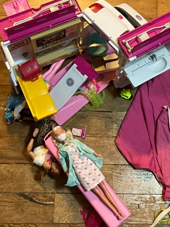 The ambulance has been out for a week or so, along with the doll tent. Two doll babies, the doll doctor, various pieces of equipment. I took the photograph because the cats keep “helping” and it keeps looking a bit like a disaster. Sigh. I wish they were just doll disasters with giant cats wandering through, not real earthquakes.