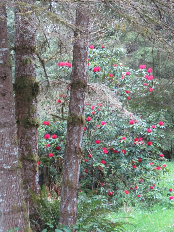 This rhododendron has grown wild for an unknown number of years. It is now about fifteen feet high and so very happy and with red, red blooms