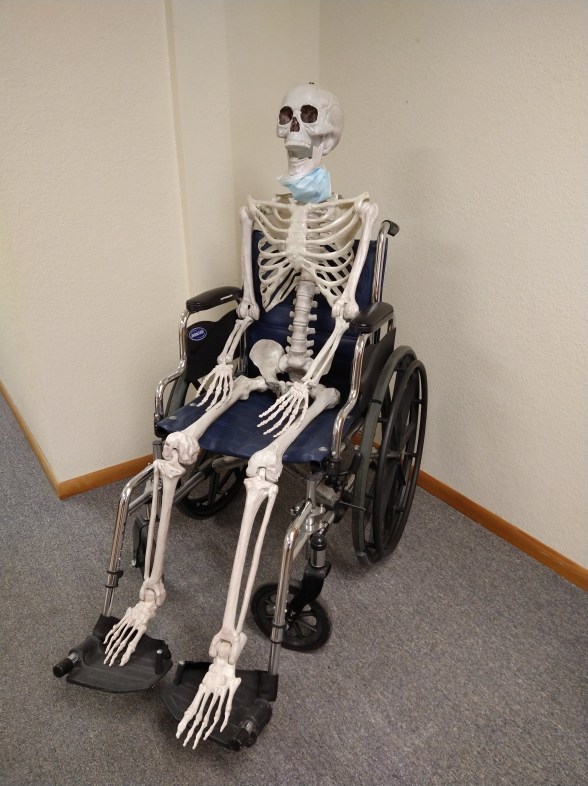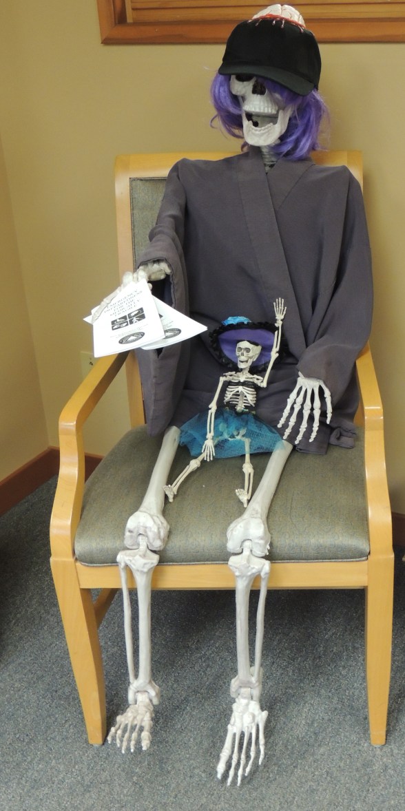 In October, Mordechai the plastic skeleton hangs out in the Quimper Family Medicine waiting room. She changes outfits. We had a 10 year old visitor who rearranged everything and now Mordechai is on fleek. She is holding out emergency preparedness pamphlets.