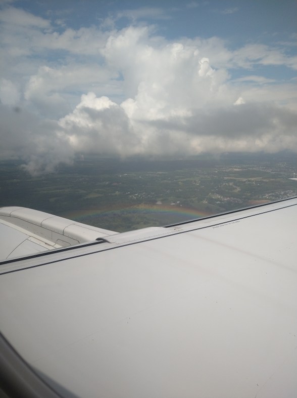 I saw a rainbow spreading out from the wing of the plane and caught part of it in the photograph. A good flight!