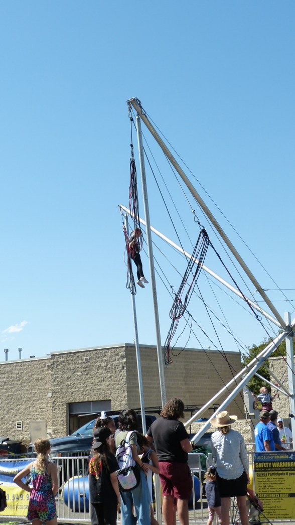 The photograph is from the Fruita Fair a few weekends ago. I really wanted to do this with the kids. Today even looking at the picture makes me slightly nauseated! Whew! They were in climbing harnesses and then attached to giant rubber bands and bouncing. Some were able to do flips, too. Not me, not today!