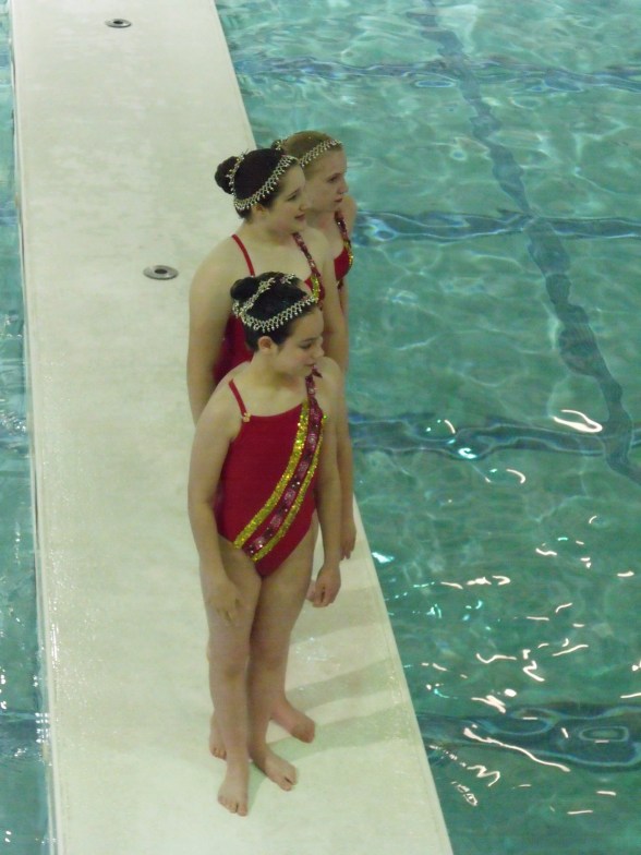 The photo is from 2006, our small town synchronized swim trio waiting for their scores after they have performed. My daughter was nine years old.