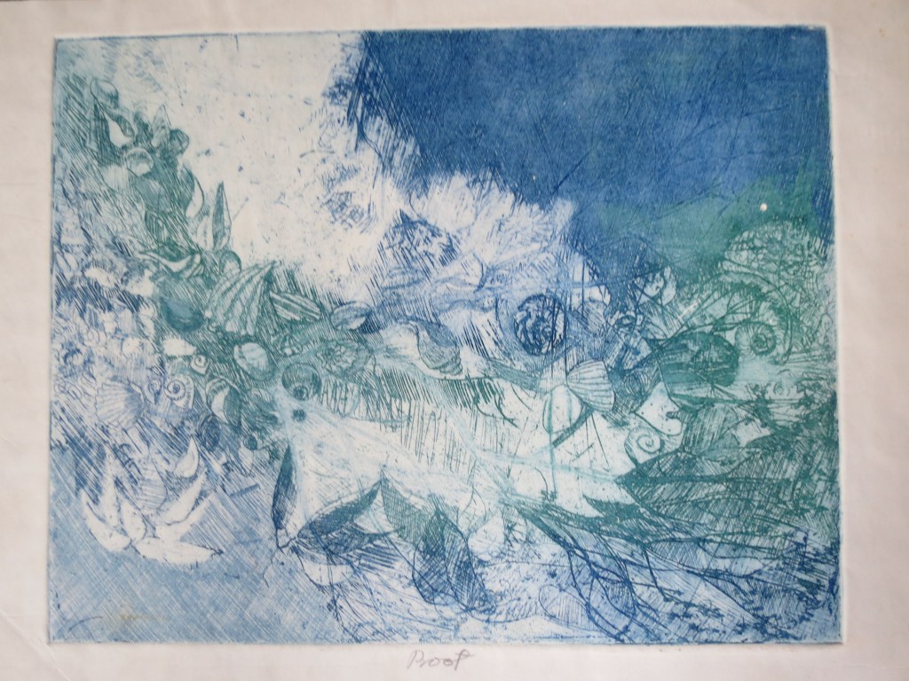 This is one of my mother’s tiny etchings. It is 2 inches by 1.5 inches. She very much enjoyed the tiny etchings. She said that tiny, etching and fantasy were NOT popular with her college professors at the University of Tennessee. She said that her friend, Maline Robinson, was doing large abstract works, both silk screen and oils and that those were much more to the professors’ tastes.