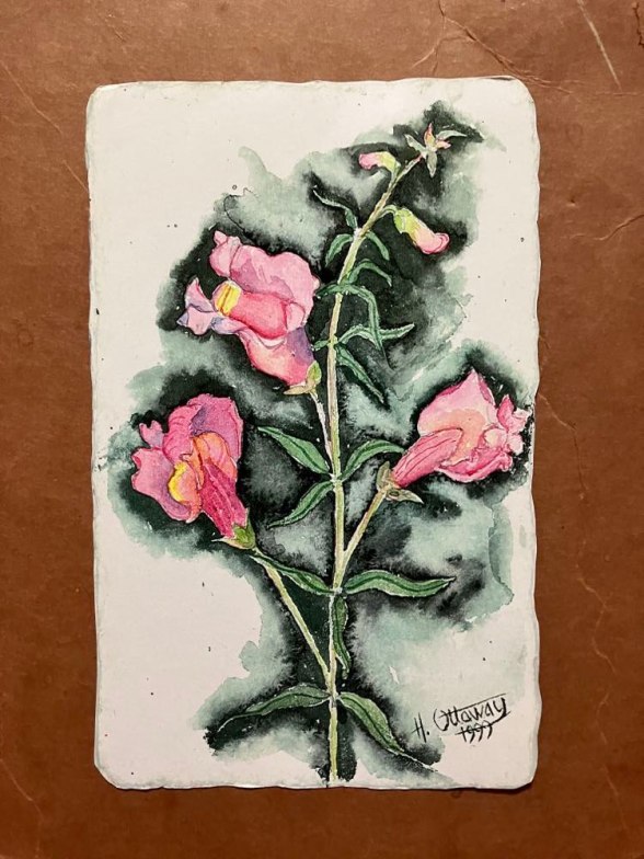 This is a watercolor postcard. Helen Burling Ottaway painted a bunch of postcards, with wonderful detail. These snapdragons could be viragos or obstetricos or perhaps both. This is from 1999, two years into her ovarian cancer. So the song is the Bald Headed Blues.