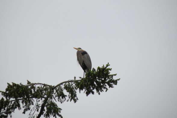 I love Great Blue Herons. We have a lot. I love them best in trees, because they still look strange to me in trees. They will perch right on the top of our tall Pacific Northwest trees and look like peculiar Christmas tree toppers. Alien angels. Their bones are lighter than ours, so they can stand on a limb that would not hold me or you.